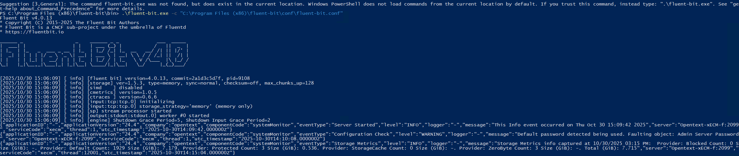 C:\OPENTEXT\OTCS\config\fluentbit\fluent-bit.conf - Admin UI: “Enable → Forward using Fluent Bit” is ON