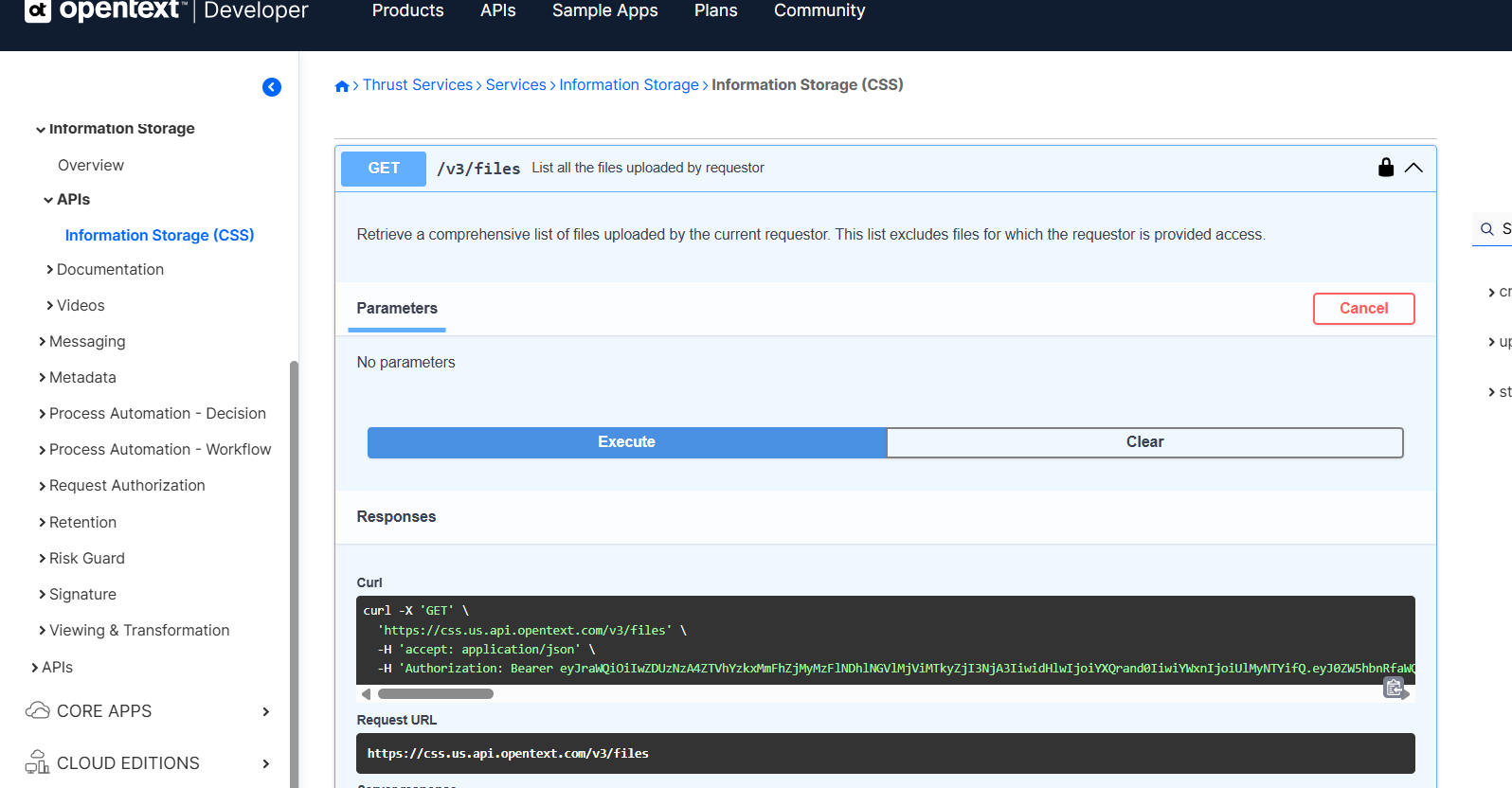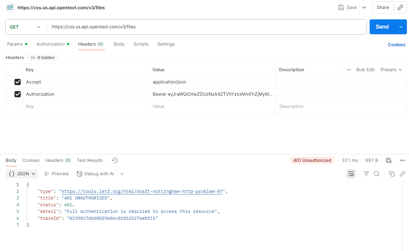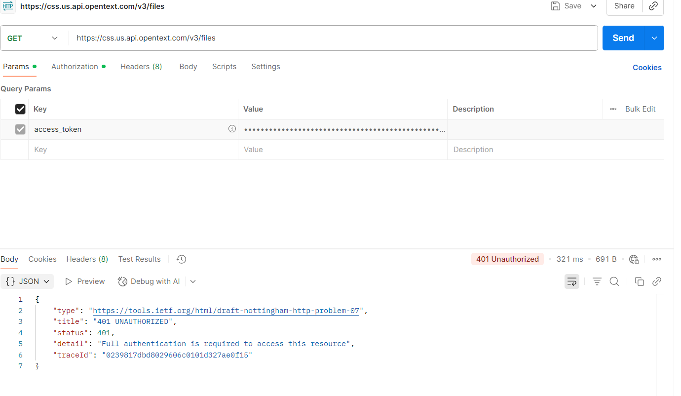 I’m trying to configure and test the OpenText API using Postman, but I’m encountering an authentication error during setup or request execution. Even though I’m able to successfully generate the access token in the Authorization tab, when I send a request to the server, I receive the following error response: